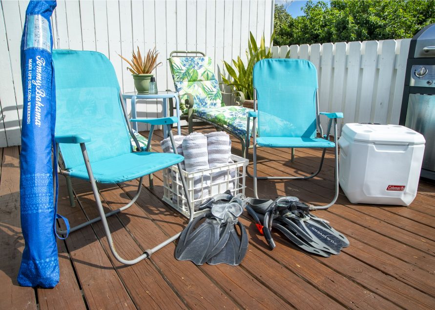 Beach Towels, Chairs, Cooler, Snorkel Gear