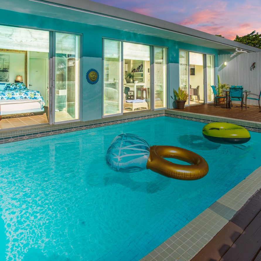 The 20′ x 14′ private swimming pool is just delightful. Cool down in the crystal clear water, anytime day or night. As you can imagine, it’s everyone’s favorite amenity.