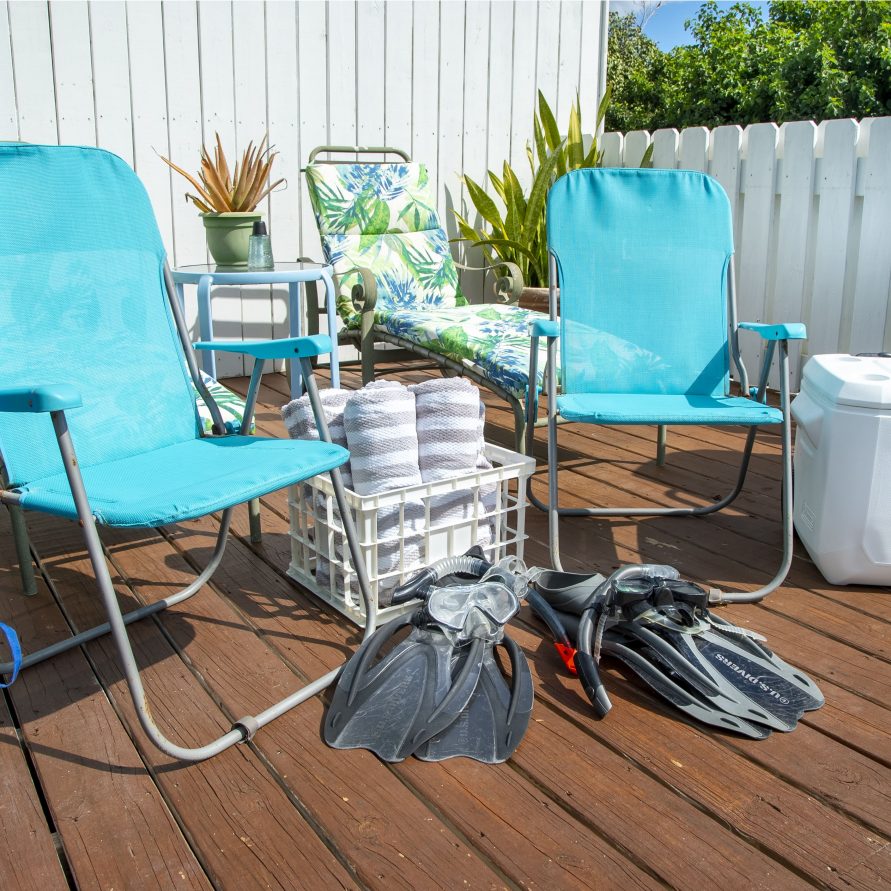Beach Towels, Chairs, Cooler, Snorkel Gear