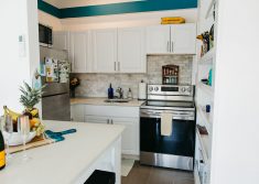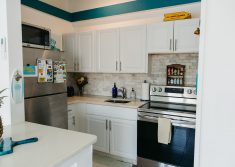 - Kitchen with full size stove, refrigerator, sink, cooking utensils