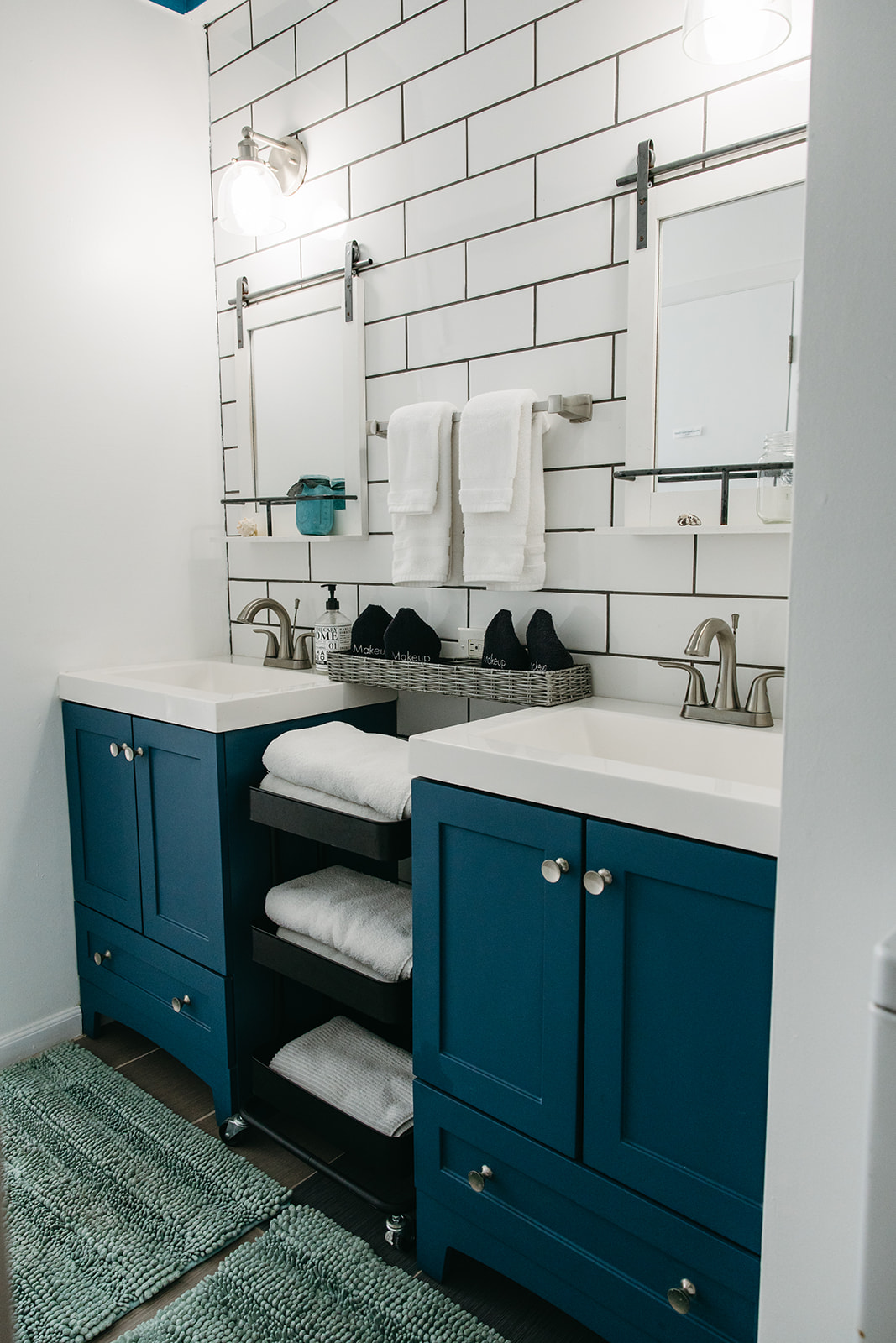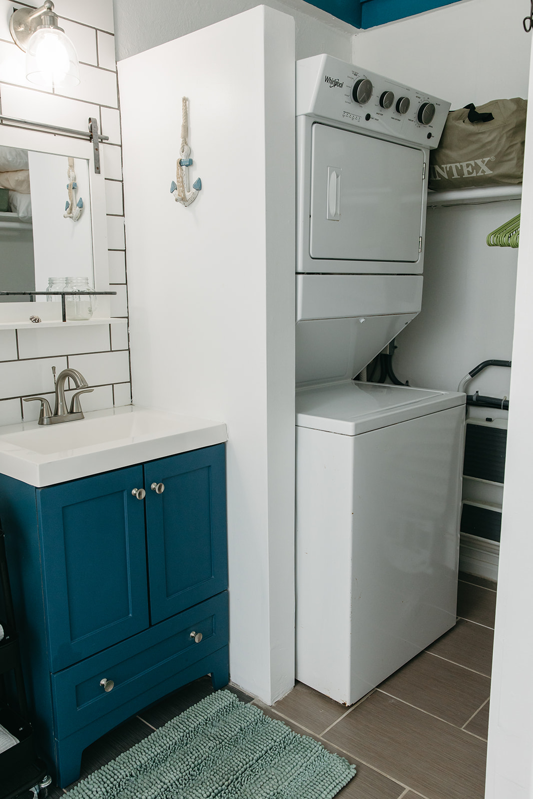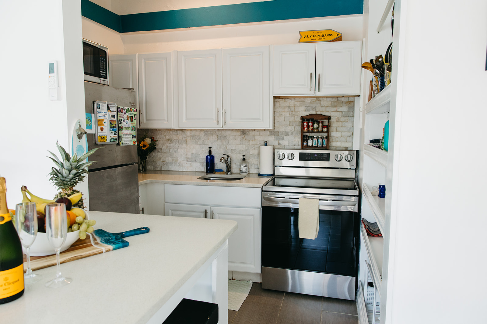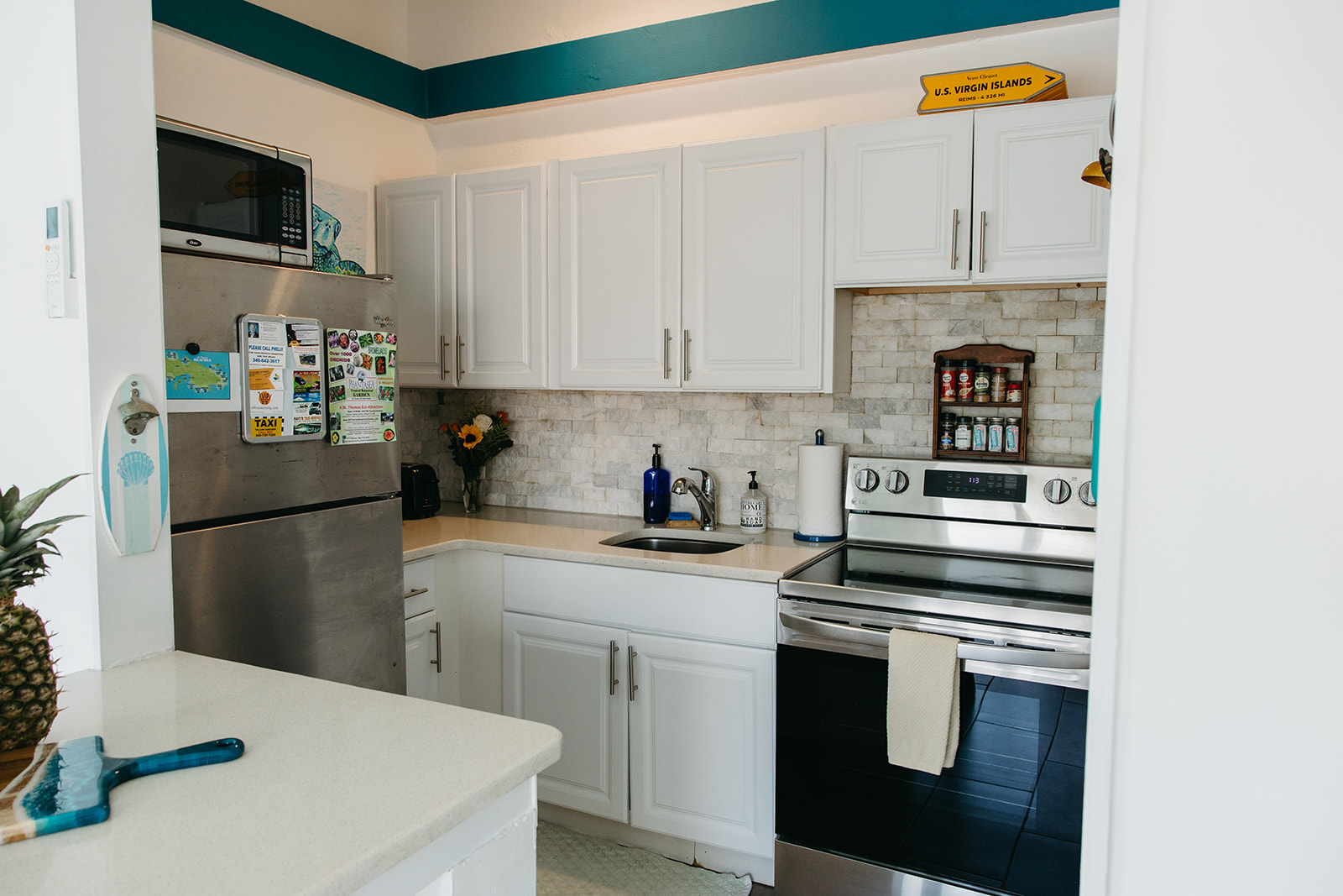 - Kitchen with full size stove, refrigerator, sink, cooking utensils